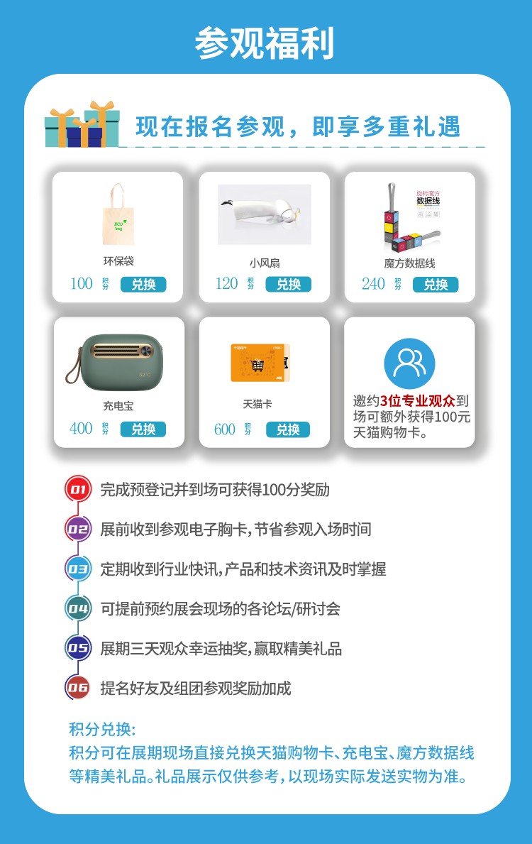 注:積分可在展期現(xiàn)場直接兌換天貓購物卡、充電寶等精美禮品。