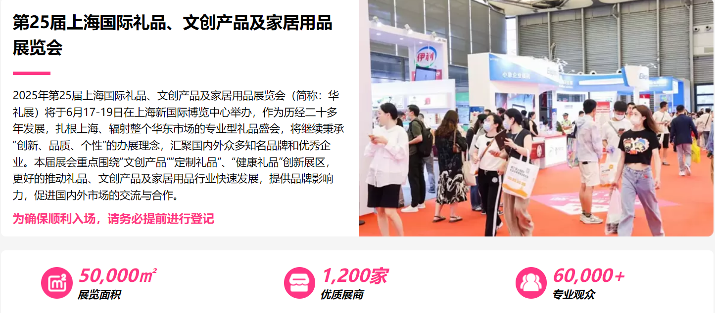 第25屆上海國際禮品、文創產品及家居用品展覽會(華禮展)將于2025年6月17日至19日在上海新國際博覽中心舉辦。該展會由上海雅輝展覽有限公司主辦,是華東地區規模領先的禮品及家居行業盛會,覆蓋商務禮贈品、文創潮玩、數碼電器、家居用品等多元化領域。