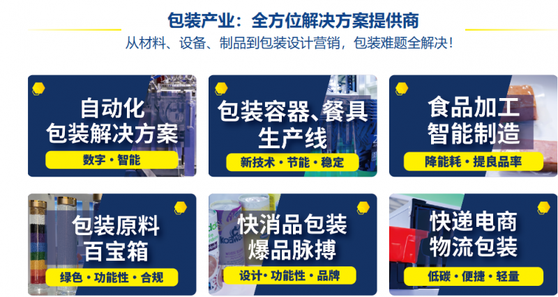 展品范圍: 食品飲料加工及包裝機械、醫藥化妝品加工及包裝機械、非食品消費品及工業品加工及包裝機械、糕點糖果及烘焙食品加工及包裝機械、塑料及紙包裝容器生產設備(瓶、杯、袋、盒等)、包裝材料生產及加工機械、包裝材料、包裝容器及包裝制成品、包裝原材料、包裝印刷、加工與包裝配件、智能/自動化包裝、物流包裝、包裝設計、服務