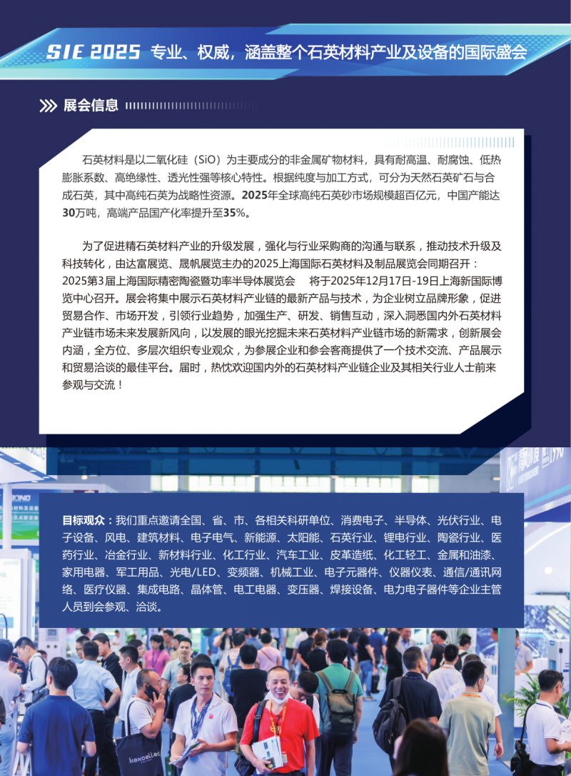 誠摯邀請您蒞臨 2025上海國際石英材料及制品展覽會,本次展會將于 2025年12月17日至19日 在上海新國際博覽中心(浦東新區龍陽路2345號)隆重舉辦。作為亞太地區石英行業的重要盛會,我們將匯聚全球頂尖供應商、技術專家及行業領袖,共同展示最新產品、技術與解決方案。