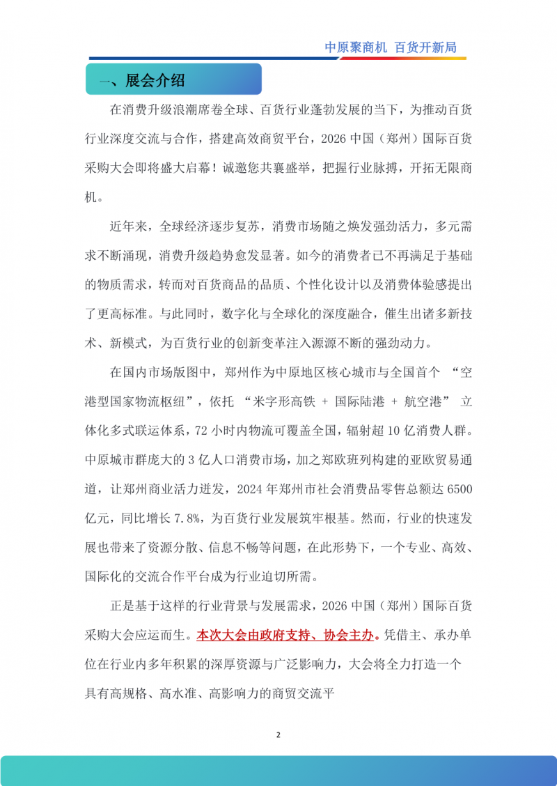 正是基于這樣的行業背景與發展需求,2026中國(鄭州)國際百貨采購大會應運而生。憑借主、承辦單位在行業內多年積累的深厚資源與廣泛影響力,大會將全力打造一個具有高規格、高水準、高影響力的商貿交流平臺。