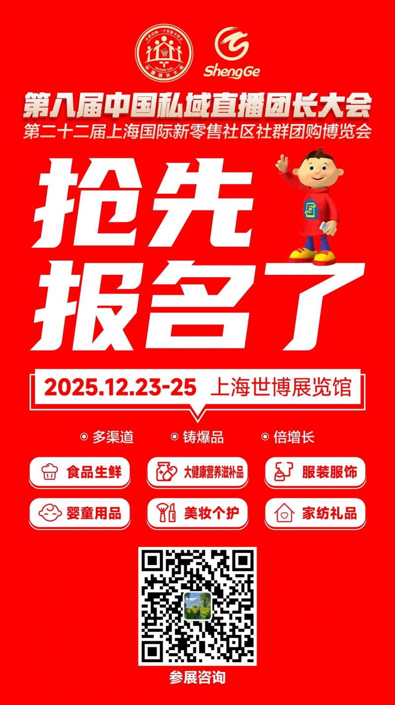 第八屆中國私域直播團長大會暨第二十二屆上海國際新零售社區社群團購博覽會將于2025年12月23-25日在上海世博展覽館繼續舉辦。