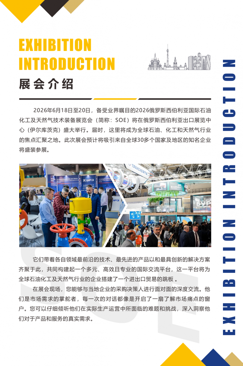 2026年6月18日至20日,一場石油化工及天然氣技術(shù)裝備展覽會將在俄羅斯西伯利亞出口展覽中心(伊爾庫茨克)舉辦。屆時,這里將吸引全球多個國家及地區(qū)的企業(yè)參展。