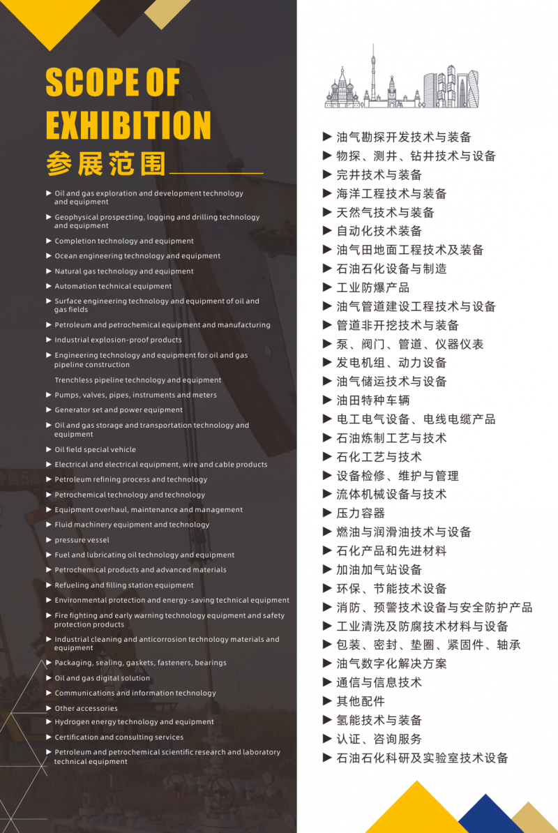 油氣勘探開發(fā)技術(shù)與裝備,物探、測井、鉆井技術(shù)與設備,完井技術(shù)與裝備,海洋工程技,術(shù)與裝備,天然氣技術(shù)與裝備,自動化技術(shù)裝備,油氣田地面工程技術(shù)及裝備,石油石化設備與制造,工業(yè)防爆產(chǎn)品,油氣管道建設工程技術(shù)與設備,管道非開挖技術(shù)與裝備,泵、閥門、管道、儀器儀表,發(fā)電機組、動力設備,油氣儲運技術(shù)與設備,油田特種車輛,電工電氣設備、電線電纜產(chǎn)品,石油煉制工藝與技術(shù),石化工藝與技術(shù),設備檢修、維護與管理,流體機械設備與技術(shù),壓力容器,燃油與潤滑油技術(shù)與設備,石化產(chǎn)品和先進材料,加油加氣站設備,環(huán)保、節(jié)能技術(shù)設備,消防、預警技術(shù)設備與安全防護產(chǎn)品,工業(yè)清洗及防腐技術(shù)材料與設備,包裝、密封、墊圈、緊固件、軸承,油氣數(shù)字化解決方案,通信與信息技術(shù),其他配件,氫能技術(shù)與裝備,認證、咨詢服務,石油石化科研及實驗室技術(shù)設備。