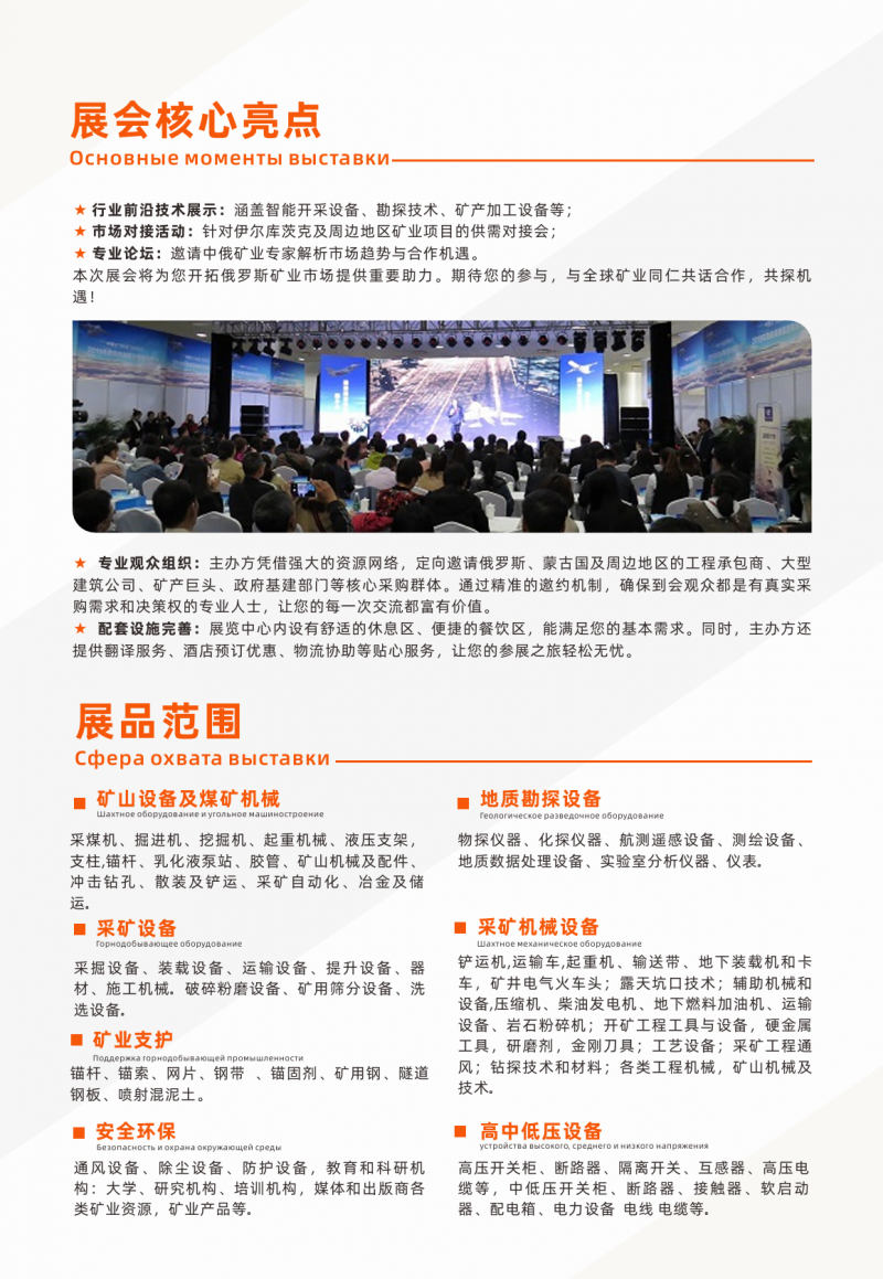 ● 市場對接活動:針對伊爾庫茨克及周邊地區(qū)礦業(yè)項目的供需對接會。