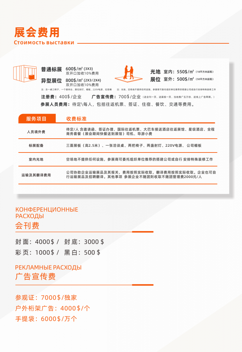 普通標展 600USD/㎡ 非標準展位 室內(nèi)光地 550USD/㎡ 室外光地 500USD/㎡