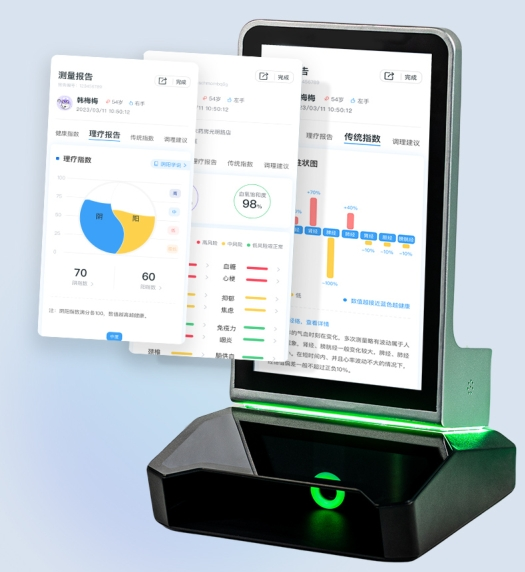 可提供經絡健康狀況、16種疾病風險評估、心率血氧、理療指數、濕氣血瘀、體質臟腑辨證、循環系統穩定度檢測.…